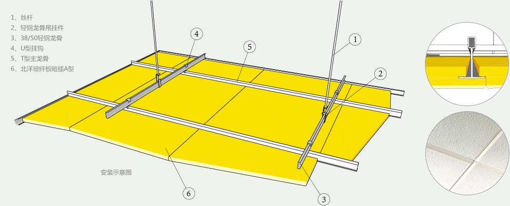 采用暗架龍骨安裝,安裝后板面遮住龍骨。拆卸方便。