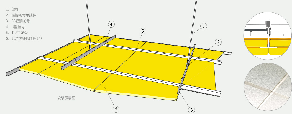 采用暗架龍骨安裝,安裝后板面遮住龍骨。不可拆卸。